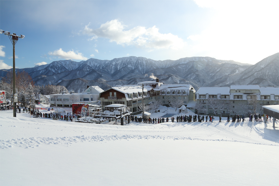 圧雪、非圧雪ともに良し、絶好のパウダーデイとあってカモシカコースを1本滑り降りてくると、アルプス第3ペアにはスノードロップまで続く長い列(写真)が出来ていました。「こんなに列が出来たところは初めて見ました。」とはパトロールさん。もしかしたらハクノリの魅力にみんなが気づき始めたのかも!