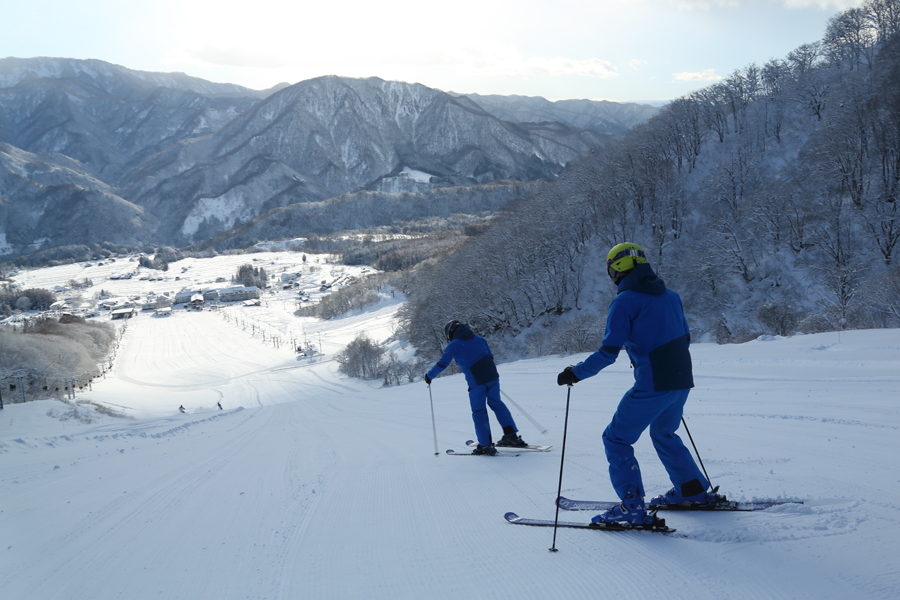 徳島県スキー連盟のお2人(写真)が「いつも見てます。この3連休は、練習に最適なハクノリで滑っています。そして滑ったあとは8時間かけて帰ります。」とお話しくださいました。適度に締まった粉雪の圧雪のラビットコース(写真)から若栗中央ゲレンデにかけて気持ち良くスピードに乗りました。