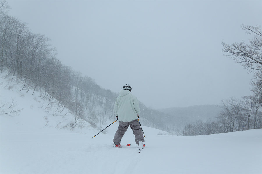 適度に締まった粉雪の圧雪にフカッとした新雪が約3cm乗ったルート2も滑りやすかったです。滋賀県からのスキーヤーさん(写真)が「いつも見てます。今日は圧雪の入ったルート2を狙って来ました。滑りやすいですね!ここで回します。」とお話しくださいました。