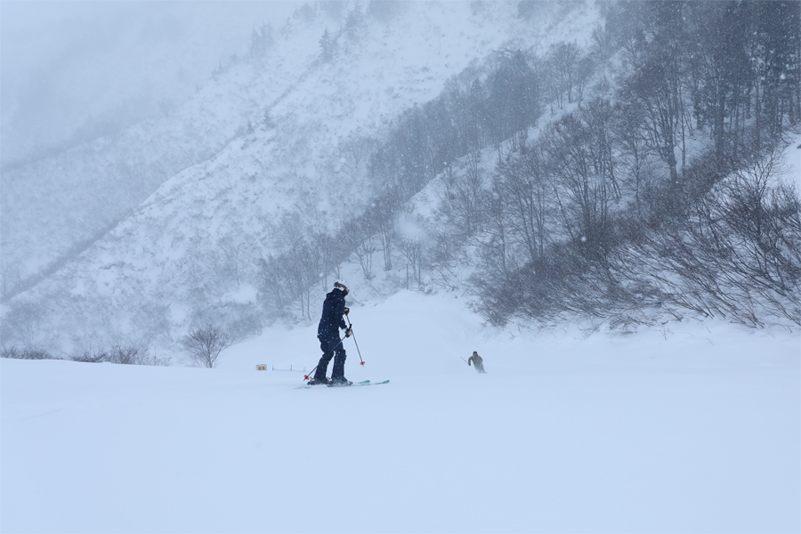 良く締まった湿雪の圧雪にサラッとした新雪が約5㎝乗ったパノラマコースとジョイフルコースではエッジがしっかりと噛み込み、気持ちよくスピードに乗れました。尚、写真右奥のスマイルコース、の先の尾根上に見えるのは第4リフト。その奥にはパラレルコース、さらに第6ゲレンデが広がっています(横に超広いスキー場!)。