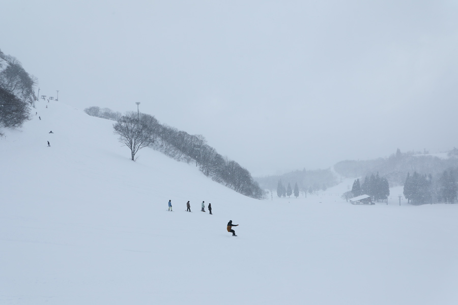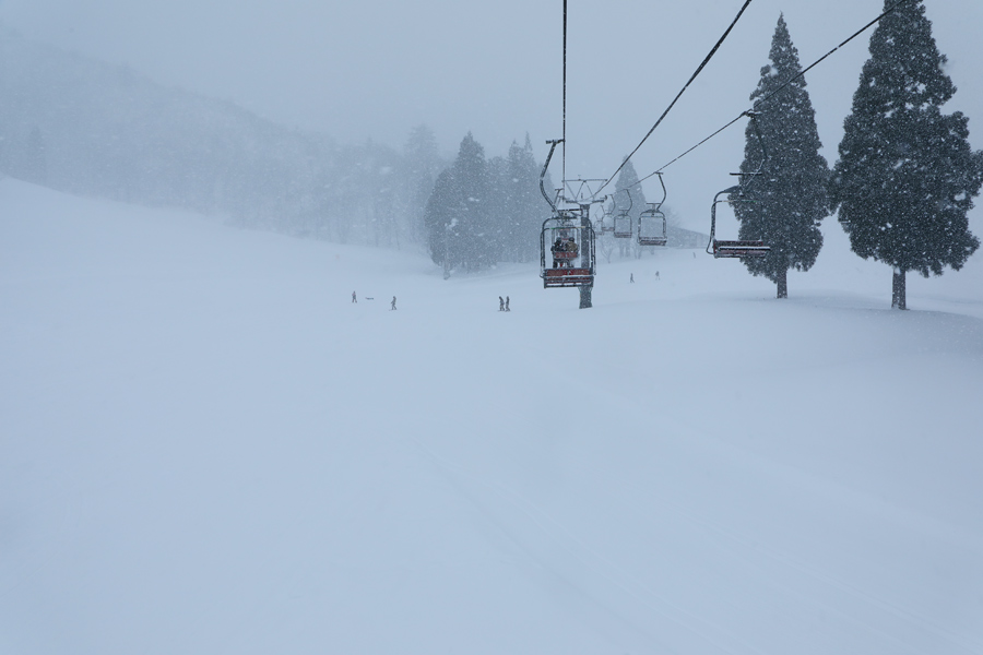 適度に締まった湿雪の圧雪のスマイルコース(写真、最大14度、平均9度、1,010m)にも湿り気の少ない新雪が約5cm乗っていました。広くて緩やかでクセのないバーンが魅力的な中里ですが、次回はユニークな付帯施設&サービスを中心にご紹介したいと思います。8時頃に収まった雪が8時半頃から再び降り始めて、日中にかけて強まりました。