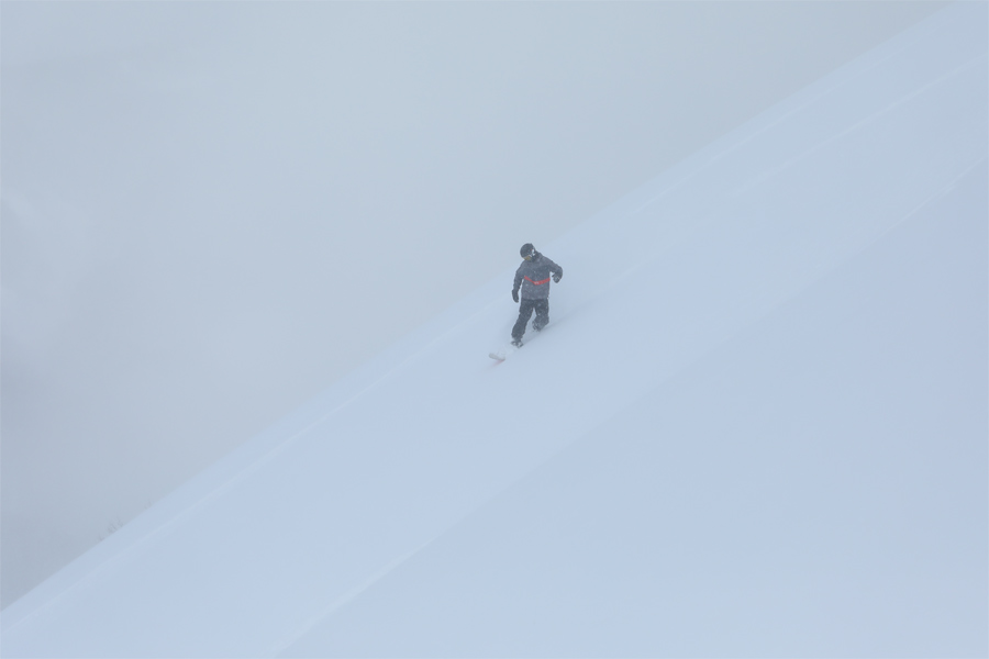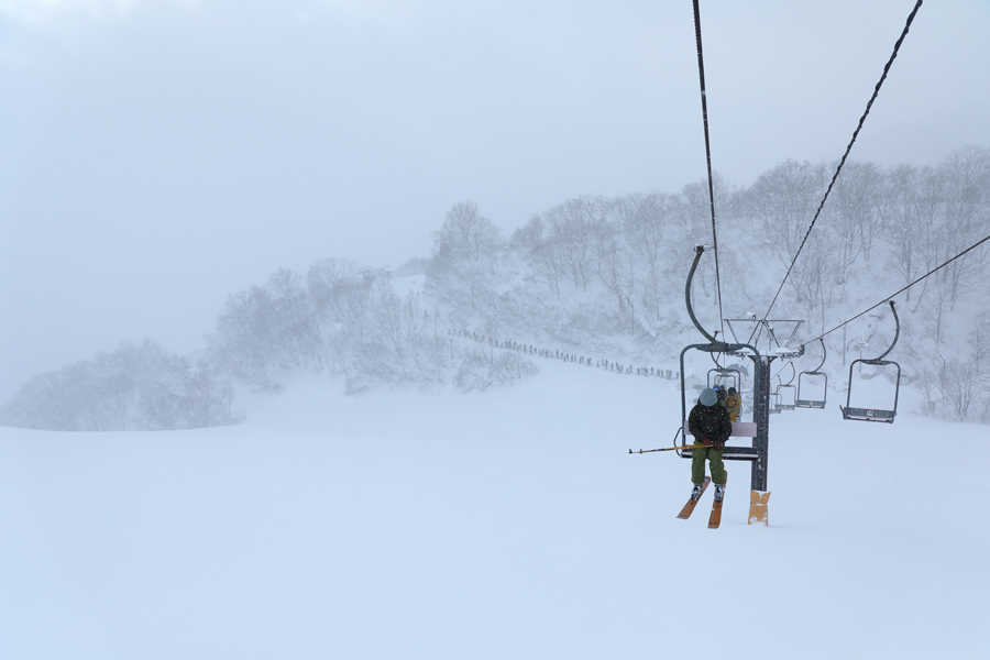 シーズンで人が最も少ないはずの1月の平日でさえ、まとまった降雪直後となれば第10ペアには長い列が出来ます(やはり、みんながハクノリの魅力に気づき始めたのかも!?)。スカイビューゲレンデの真っ新な雪面にメジャーを差し込むと新雪量は25~35cm。硬くない起伏に乗ったフカフカの新雪により抜群の浮遊感を得られました!