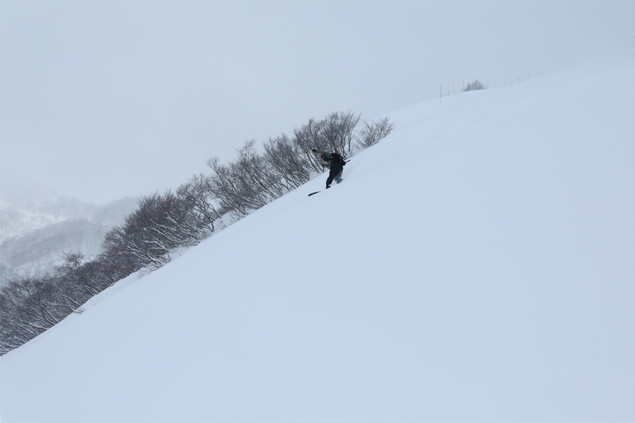 非圧雪急斜面、ジャイアントコース(写真、最大37度、平均30度、500m)にはフカフカの新雪が30~35cm。ファーストトラックを獲得したスノーボーダーさん(写真)が「いつも見てます!スノーナビさんはここに来る前にどこを滑ったのですか?」とお話しくださいました(まだ低木が出た野趣溢れるヒエ3を滑って来ました)。