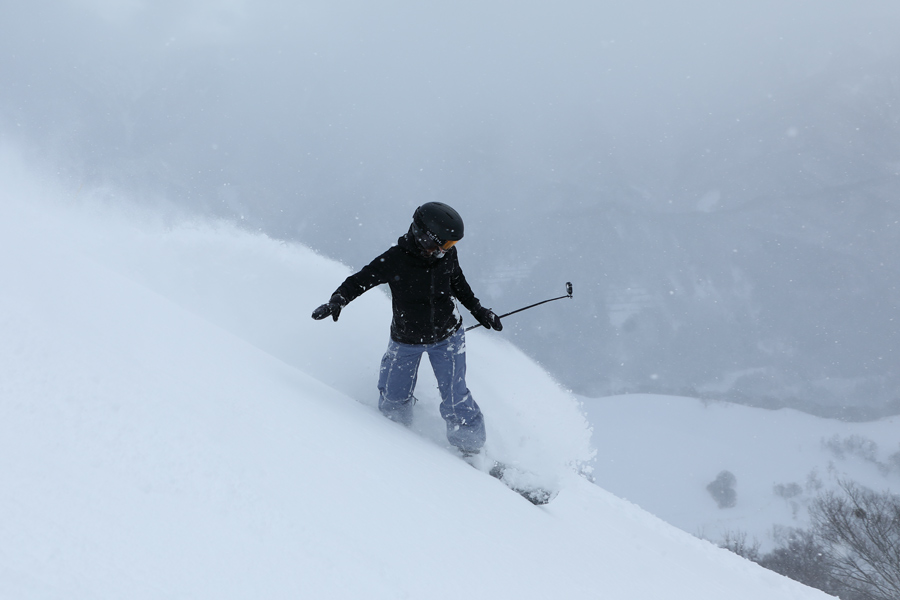 ジャイアントには下地に深いコブがありましたが、ある程度スピードに乗れば浮力を得られ、底付きせずに気持ち良く滑れました。最高の雪と高度感のある景色に気分が上がる瞬間!池の田、一本松、わらび平といった圧雪コースは適度に柔らかな粉雪の圧雪でした。