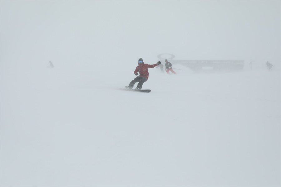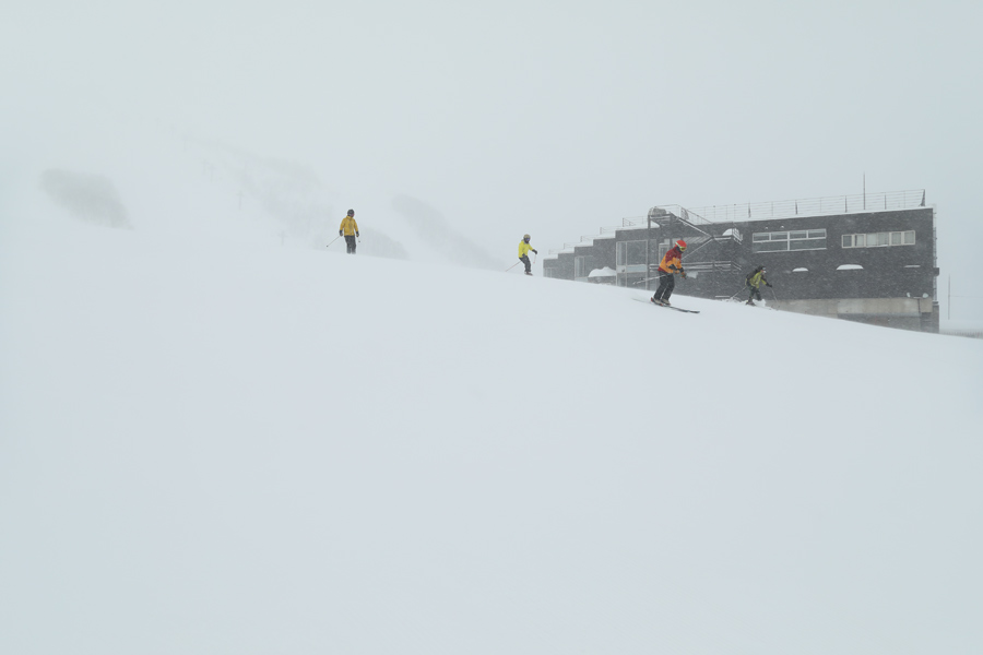昨日のレポに「何てことはありません」などと書きましたが、これだけ風の強い日が続くと心が折れそうですw 冬将軍様、ご配慮のほどよろしくお願いいたします。強い北東風に乗ってわずかに湿った雪が勢いよく降る兎平をあとにして、整備の行き届いたリーゼンスラロームコース(写真)を滑り出しました。