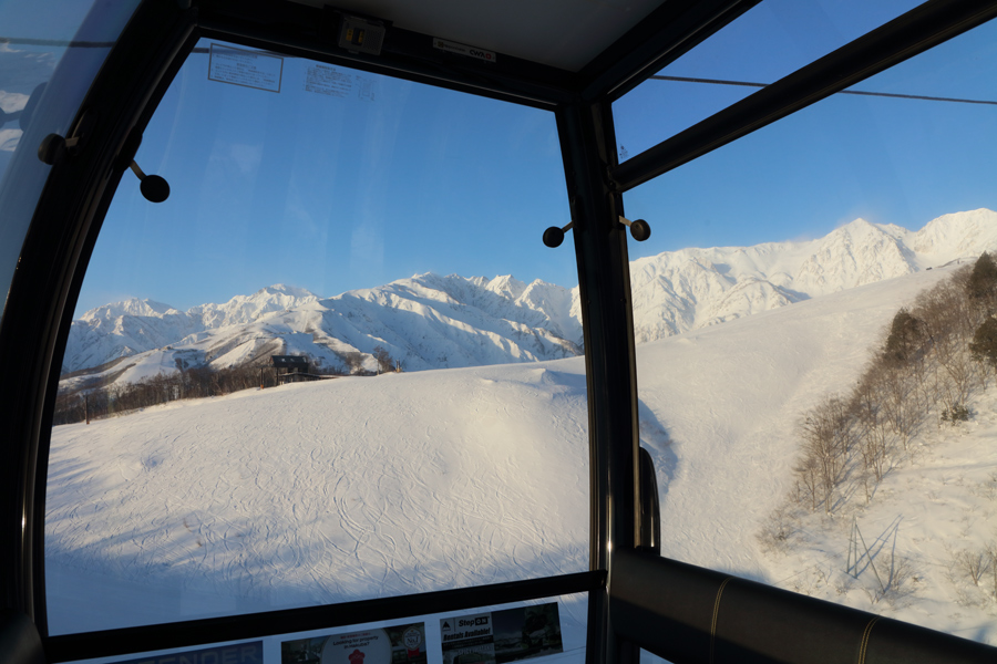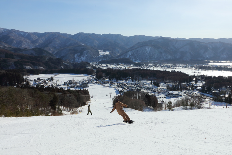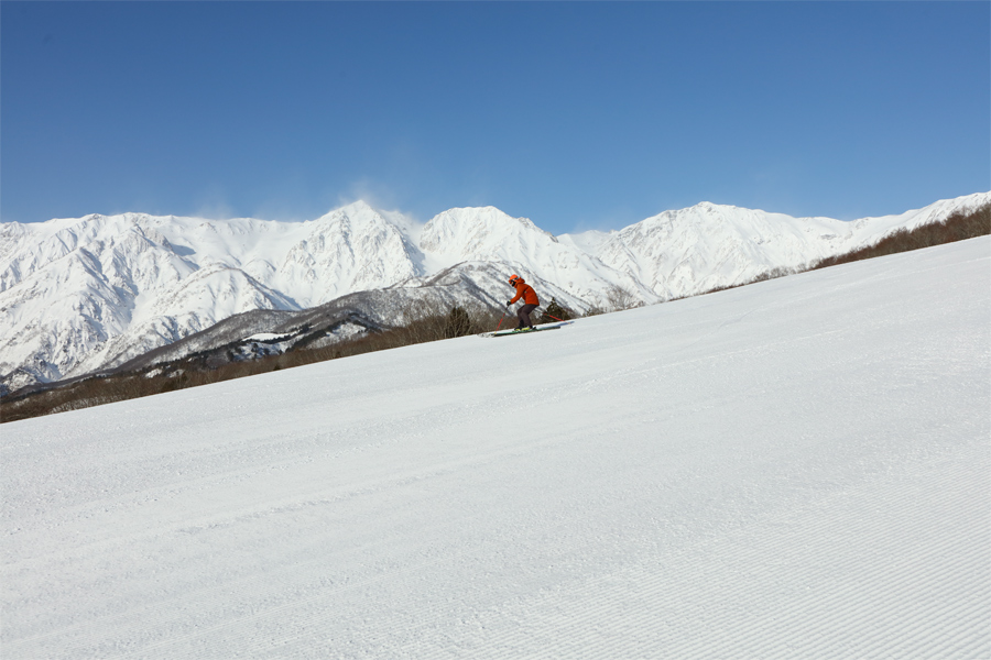 ゴンドラ回しなら岩岳へ!圧雪のサニーバレーコース(写真)は全長3.3kmという十分な長さに、最大24度、平均11度の適度な緩急、南→東→南→北→東と変わる斜面の向き、そして何より序盤に HAKUBA VALLEY 随一の絶景を備える、魅力的なダウンヒルコースです。さらに、上り返す時は昨季開業した最新のゴンドラのため快適です。