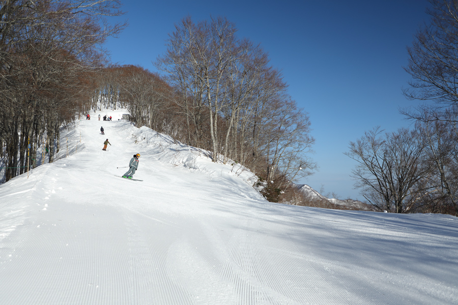 3日連続の晴天となりました。1月らしくない暖かさが続いて圧雪の稗田山林間コース(写真)は適度に締まった板の走る湿雪コンディション。スピードに乗って、2つあるヘアピン(写真は1つ目)で身体にかかるG(※たぶん4~6Gくらい)も楽しみながら第4ペア乗り場まで滑りました。