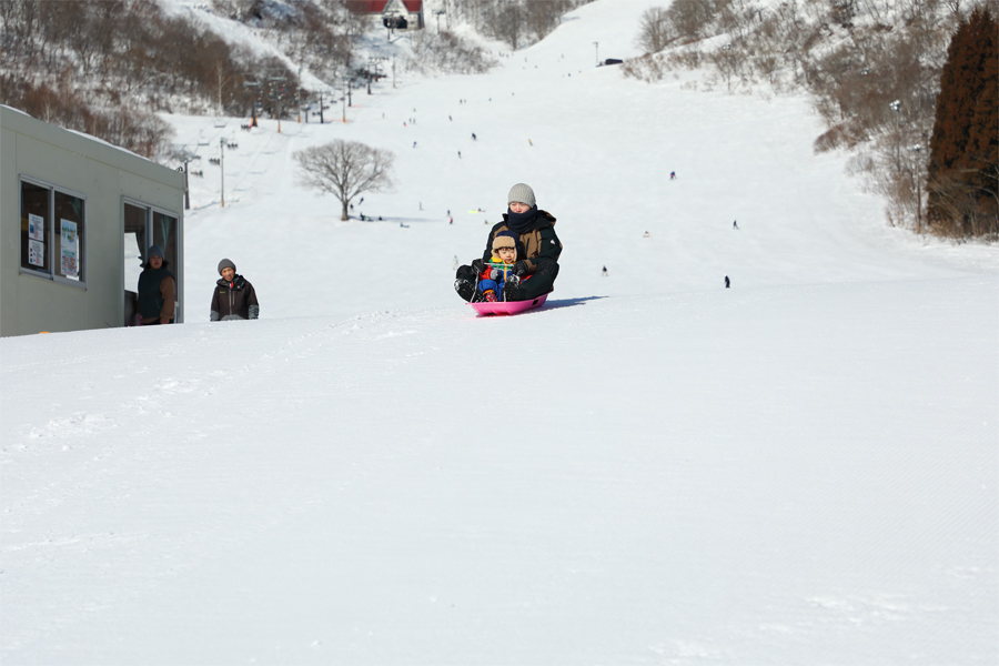 池の田ゲレンデと一本松コースも適度に締まった板の走る湿雪の圧雪でした。ベースエリアにあるキッズパークも同様の、ソリが良く走るコンディション。営業開始直後は雪遊び広場が人気で、9時半頃からソリエリア(写真)も賑わい始めました。