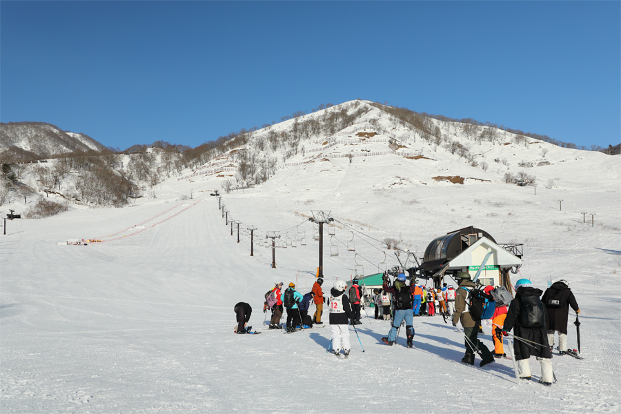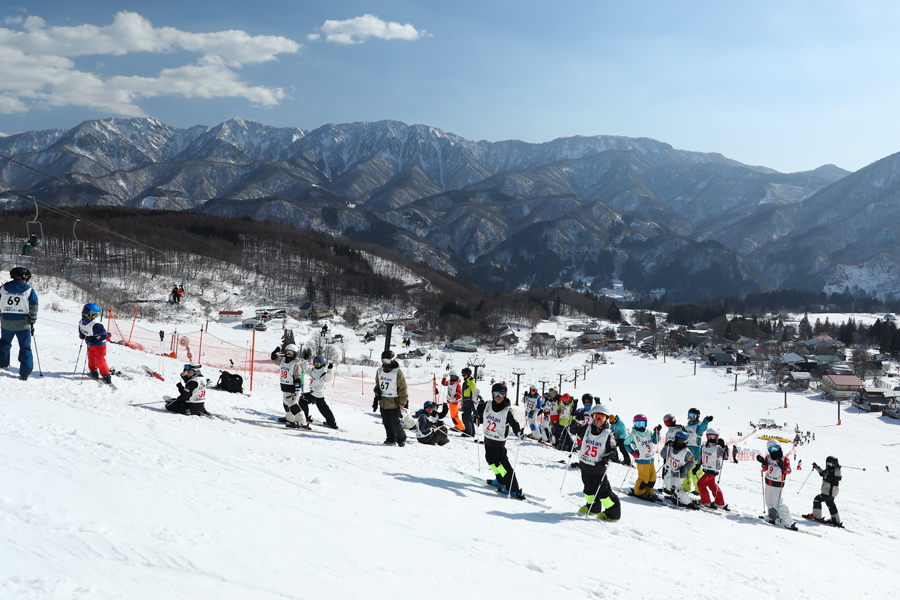 「いつも見てます!おーい、みんなー、スノーナビさんが撮ってくれるよ!」と選手にお声掛けくださったのは京都府からのお父さん(フレーム外)。「うちの子(写真中央のビブNo.22と25)が今大会の最年少で出場しています。大阪府スキー連盟が主催する大会ですが、日本で唯一の小学生のモーグルの全国大会で、今季の小学生日本一が決まります。」とお話しくださいました。