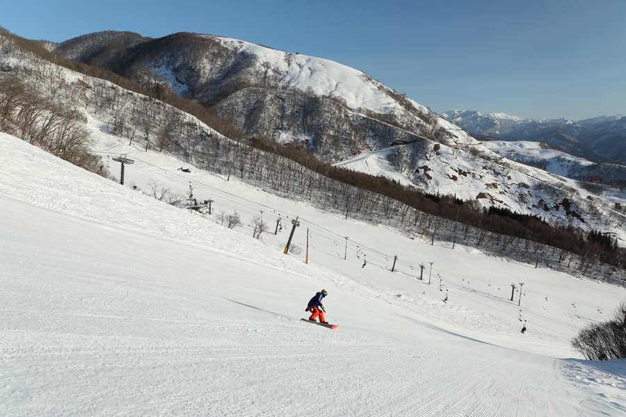 ハイウェイコース(写真)を一気に滑り降りると、日差しと気温の高さによりじんわりと汗ばみました。若栗中央ゲレンデと若栗林間コースは適度に締まった湿雪の圧雪。まもなく圧雪バーンの表面が緩み始めて、10時過ぎから雲が北アルプスを越えて張り出して来ました。