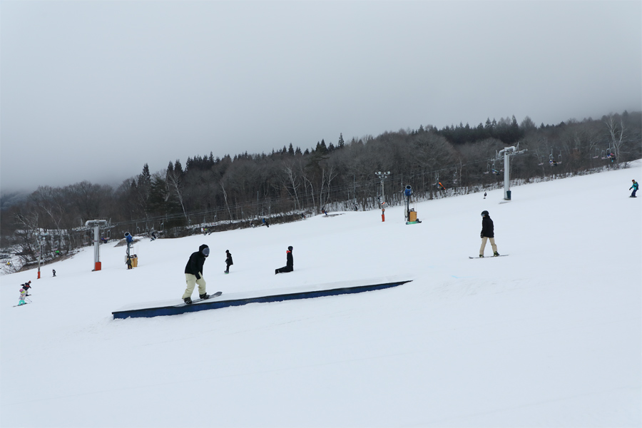 「毎年 オリオンツアー を利用して小丸山に来ています。今回はスノボデビューの子を連れてきました。」とは神奈川県からの4名様。9時頃になると若い世代のグループで第1ゲレンデは華やかな雰囲気になり、初級パーク(写真)に入る姿も見られるようになりました。