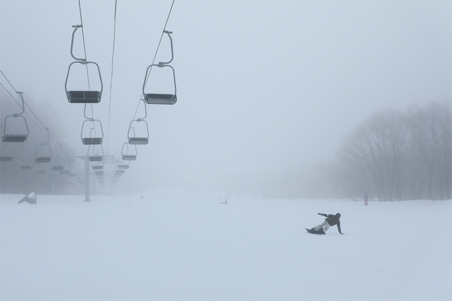 その後濃いガスに包まれ、硬く締まった湿雪の圧雪の第3ゲレンデの視界は真っ白になりました。同様に硬く締まった湿雪の圧雪の第2ゲレンデ(※中級パークあり)をしっかりエッジを効かせて滑りました。お昼頃になると日が差し始めて青空が広がっていきました。