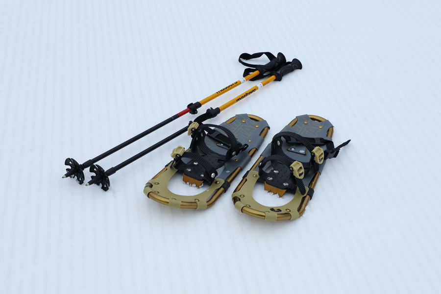 1/17(土)に、しらゆき平(写真)~レイクダウンのトップを往復する スノーシュールート(PDF)がオープンしました!ルートには道しるべとなる番号付きのサインがあります。また、手ぶらで来ても、カストルプラザのレンタルコーナーかスノーフレンズパークでスノーシュー&ポールセット(写真)を大人2,500円、小学生1,500円でレンタル出来ます。