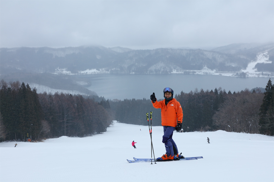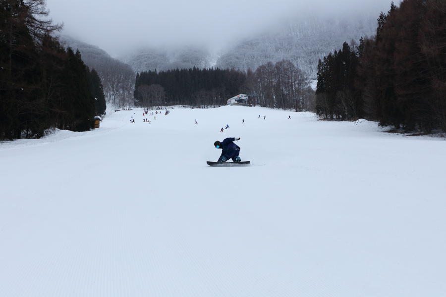 風がほぼない中、細かい粒の雪が弱く降っていました。軽い新雪が約1cm乗ったレイクダウン(写真)とレイクビューは良く締まった湿雪の圧雪。昨晩風が強かったのかバーンには枯葉や枝が散見されましたが、滑りに支障はなく、気持ち良くスピードに乗れました。