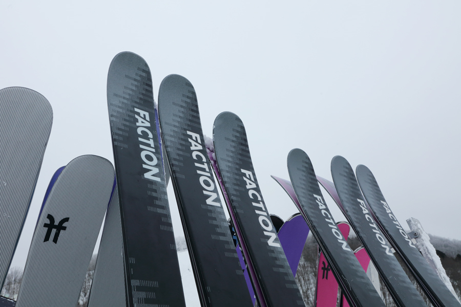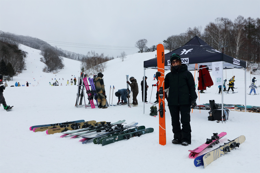 試乗できる2026-27シーズンモデルの FACTION の板はズラリ40本!参加された東京都からの男性が「いつも見てます!大町温泉郷にある 緑翠亭景水 に泊まって滑りに来ました。新しいスキー板を買おうと最近の板の乗り心地を確かめています。」とお話くださいました。