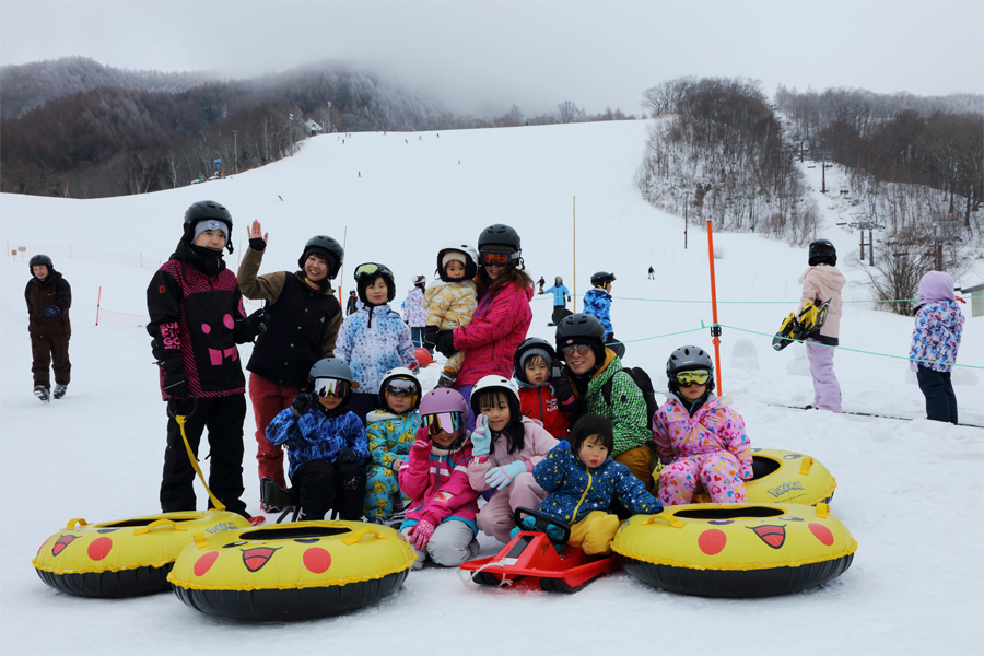 塩尻市からのご家族(写真)が「3家族で遊びに来ています。子供の年齢層が違っても、それぞれが楽しめて良いですね。」とお話くださいました。小学生のリフト乗車が無料になる「スキーこどもの日」とあって、ゲレンデではいつもの週末以上にファミリーが目立ちました。