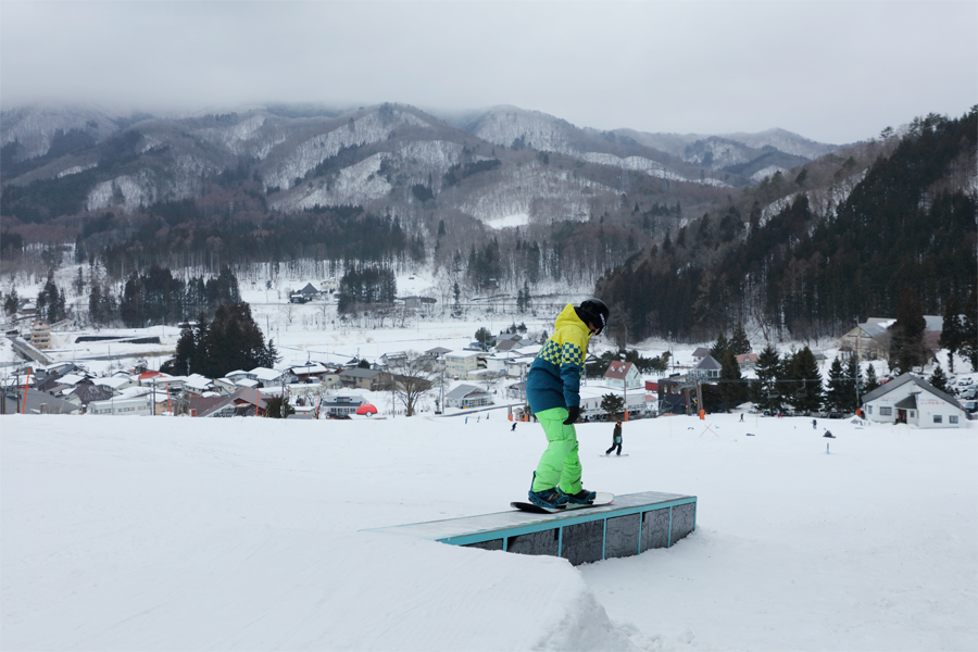 硬めの湿雪の圧雪のコース1-A、黒沢ゲレンデ、一本ブナダウンヒルコースでは板が良く走りました。中綱ゲレンデでは スノーパーク DSP(写真)がオープン中。ナローBOX、太丸レール、ナローBOX、6mシングルレール、土台跡、黒塩ビ、カズちゃんレールtoジャバラ、フラットアップレールのほか、BOX、塩ビ、レールが並んだハイクアップパークもありました。