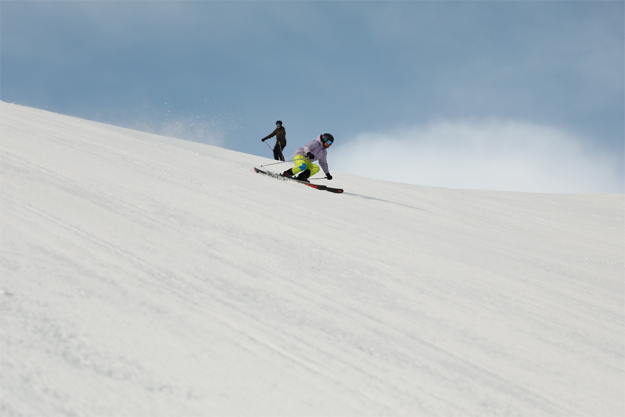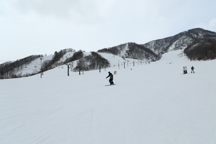 適度に締まった湿雪の圧雪のカモシカコースの前半とハイウェイコース(写真)では、エッジがしっかりと噛み込み、板が走って気持ち良くスピードに乗れました。はくのりファミリー、若栗中央、若栗林間は”砂浜のような”細かなザラメ雪の圧雪。整備が行き届いたバーンで思い通りのターンを繰り返せました。
