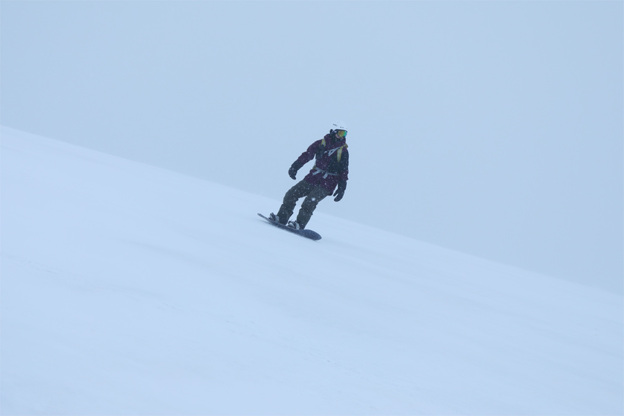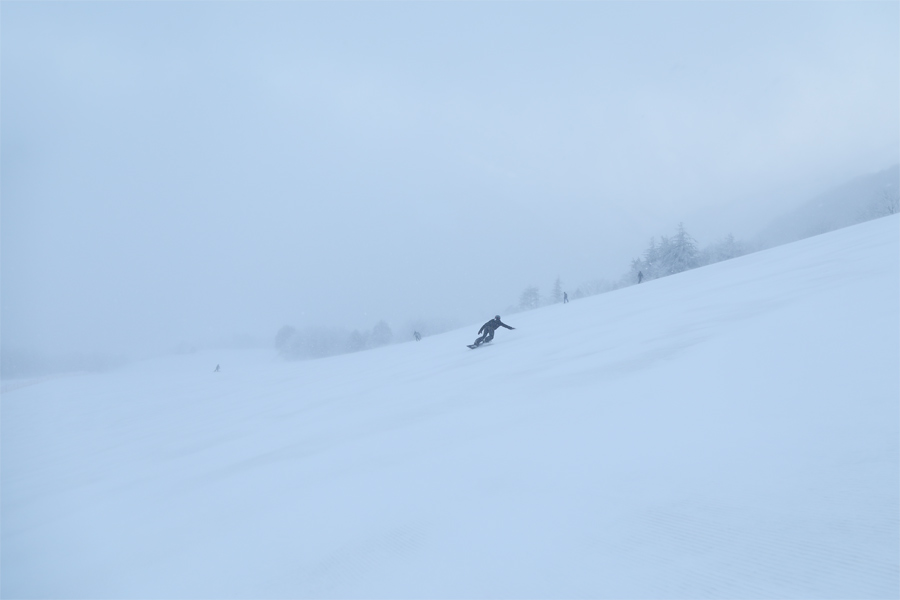 取材を始めてすぐにカメラを構える手が悴みました。サウスゲレンデ(写真)とイーストゲレンデは、昨日までの暖かさで緩んだバーンが昨晩の圧雪後にガチッと固まり、硬さを感じるフラットバーン。ザーッと音がしましたが、斑に乗った新雪0~2cmがクッションになってエッジがかかり、結果、思い通りのターンを繰り返せました。