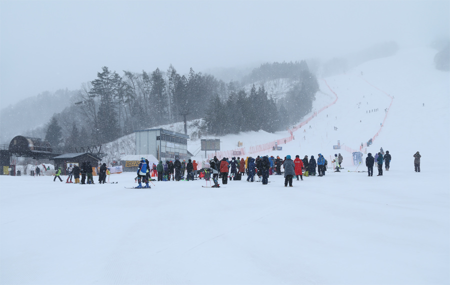 「長野県スキー大会週間(1/15~20)」のためクローズ中のかもしか(写真)では中学生のスラローム大会が行われていました。軽い新雪が1~2cm乗ったサニーバレーコースは序盤が硬めの湿雪の圧雪、中~終盤が硬めのザラメ雪の圧雪。かもしかも硬めのザラメ雪の圧雪でした。