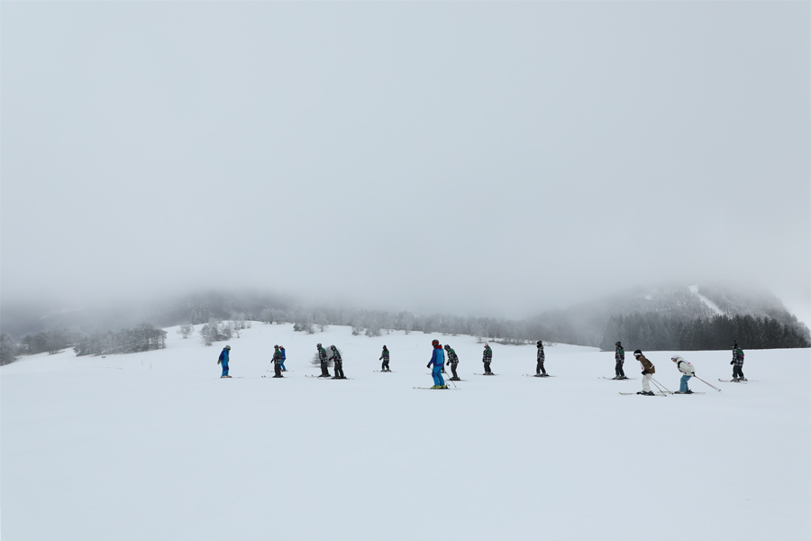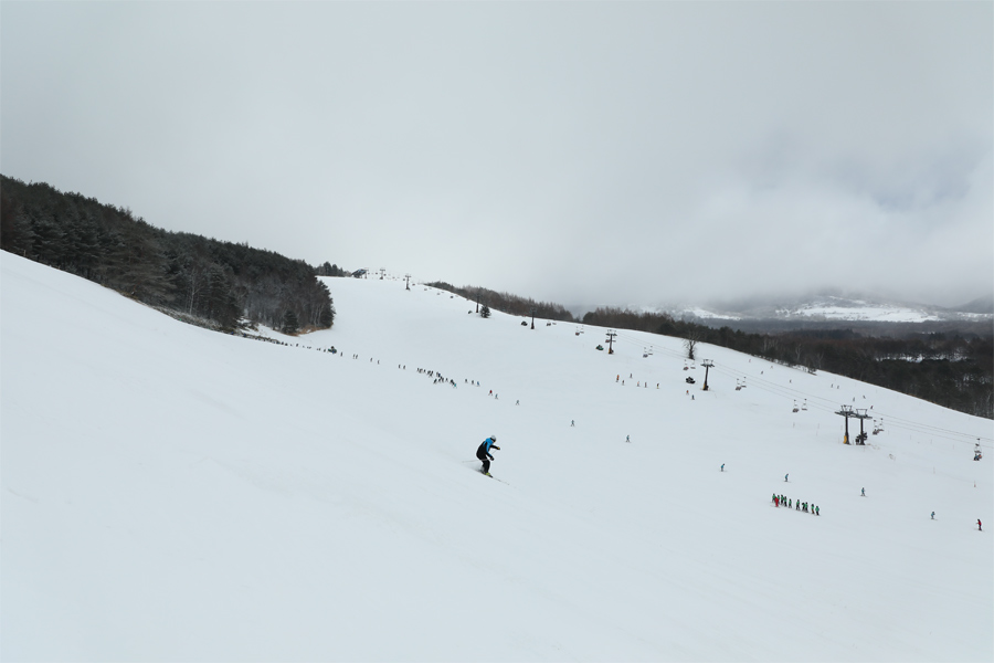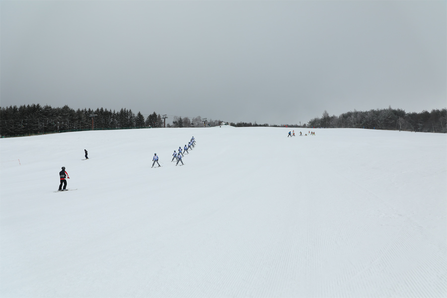 1つ1つのゲレンデが広いダボスエリアでは修学旅行生を対象としたスキー教室が盛んに行われていました。今季最強最長と言われる寒波の到来により、強い北風に乗って雪が真横から吹き付けて来る朝。アクセス路には雪が沢山積もっていましたが、開けたここでは新雪がほとんど飛ばされてしまい、斑に1~2cm乗った程度でした。