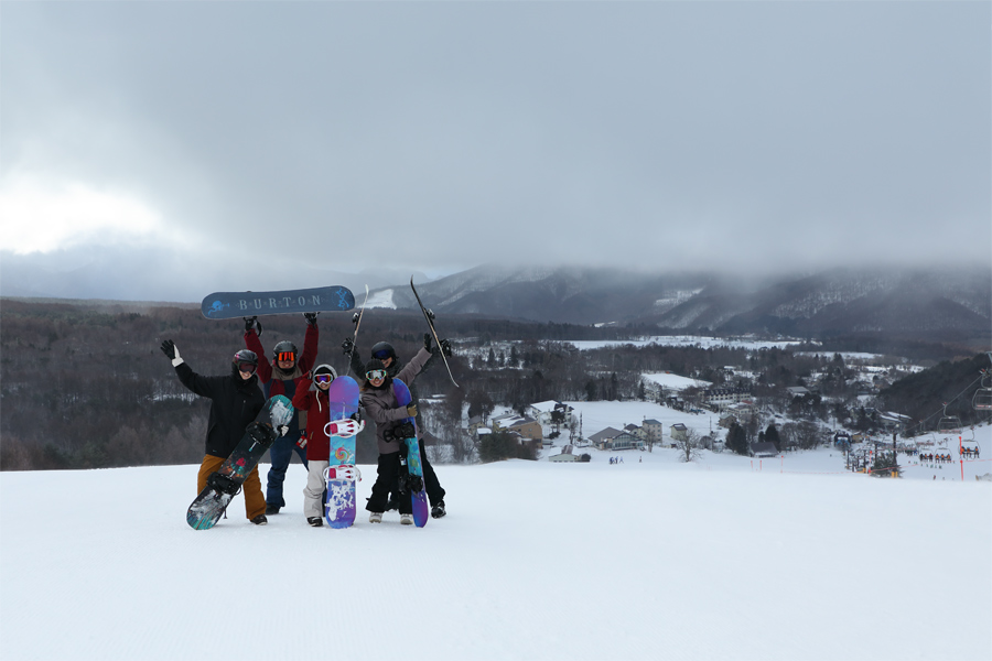 長野県長和町からの5名様(写真)が「Snownavi は見たことがあります。菅平には職場仲間と良く滑りに来ます。今日のバーンは硬めですが、菅平のゲレンデはどこも広いので、初心者がいても安心して滑れます!」とお話しくださいました。湿雪の圧雪のダボスイーストとダボスウェストは、ややエッジが噛みにくい硬めのバーンでした。