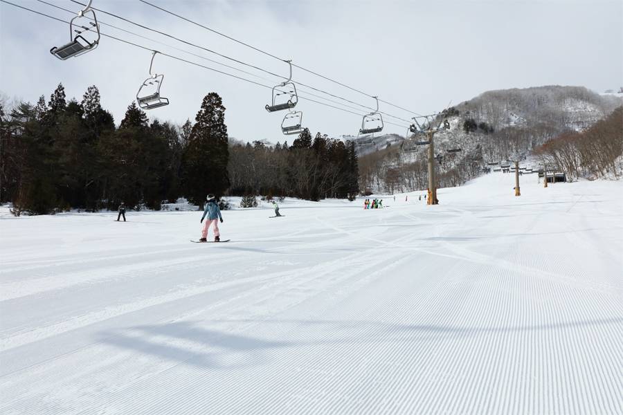 兎平・南側ルートと同様の雪質だった黒菱第2クワッド沿い(写真)では気持ちよく大回りを展開できました。”粉雪感のある”湿雪の圧雪のスカイラインコースは黒菱に比べると硬め。気温は非常に低かったですが、風がほぼなくて過ごしやすく感じました。