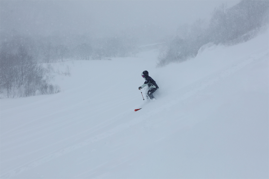 という訳で、今日は圧雪、非圧雪で新雪量に差はあれ、全面がパウダー天国です!適度に締まった粉雪の圧雪のハンの木ゲレンデには、軽い新雪が序盤に2cm、中盤に10~15cm、中盤の急斜面の非圧雪エリアに30~40cm!大きな雪煙と歓声が続々と上がっていました。