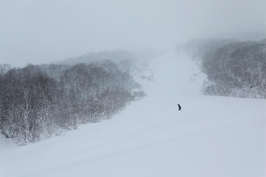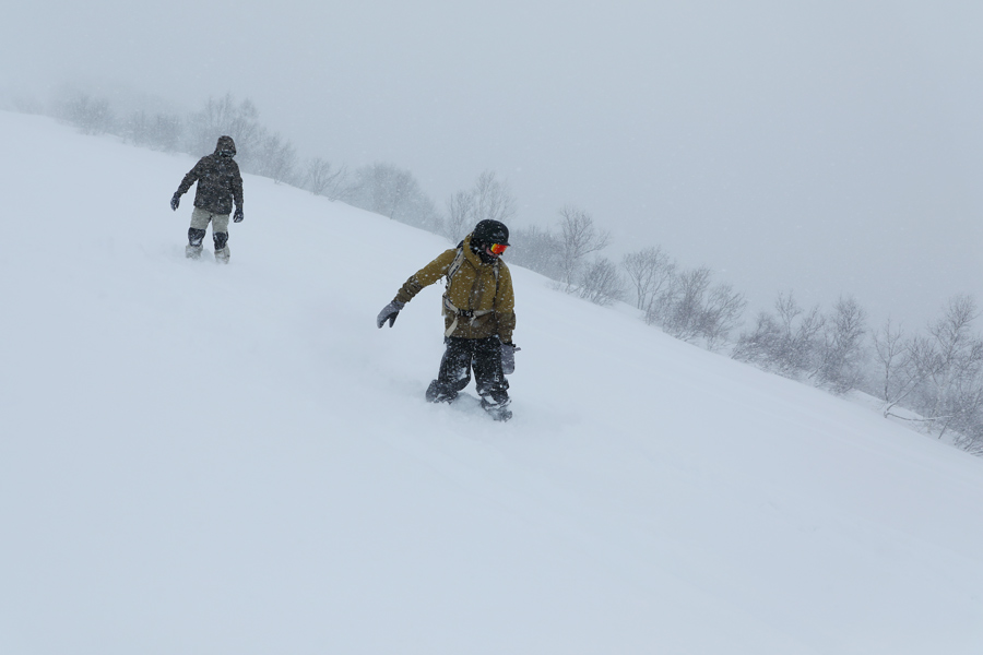 ヒエ3の中~終盤(写真)には細い低木の先がまばらに顔を出しています。斜度があるうえに硬めの大きなコブが新雪の下に潜んでいたので歯応えアリ。池の田ゲレンデに出てふと見上げると、1/16(金)から閉鎖されていた稗田山コース2を滑る人がいるではありませんか!