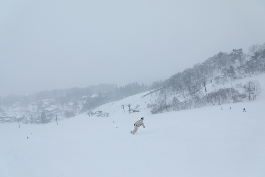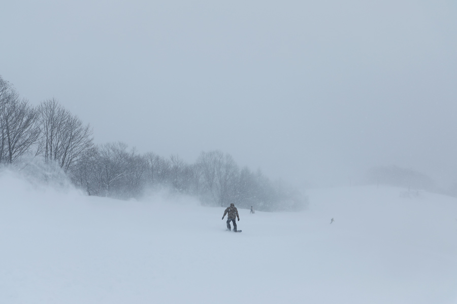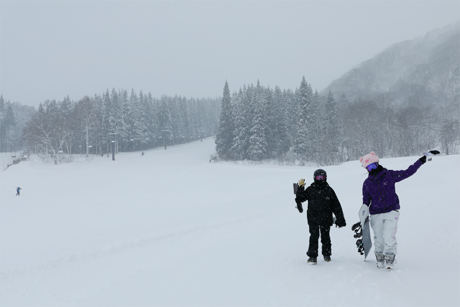第10ペアが動き始めると、乗り場にできた長蛇の列から歓声が上がりました。スカイビューゲレンデ(写真)には軽い新雪が35~40cm!下地にある大きな起伏は硬めでしたが、スピードに乗れば浮力を得られ、底付きせずに気持ち良く滑れました。