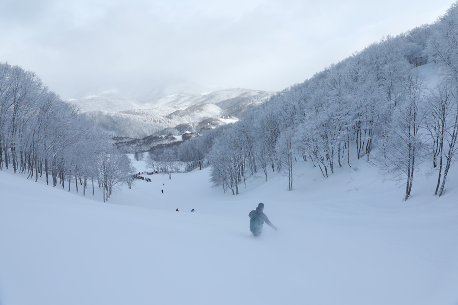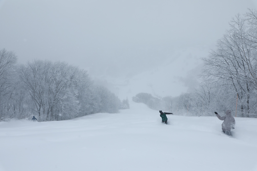 公式ライブカメラ をチェックすると、昨晩19時頃に積もり出した雪が40cm以上にもなっていました。8時にスーパークワッド乗り場に着くと既に50mほどの乗車待ちの列が(遅かった!)。まずは非圧雪のジャイアント中盤(写真)にドロップインしてヒザ上、フカフカな新雪40~50cmを頂きました。