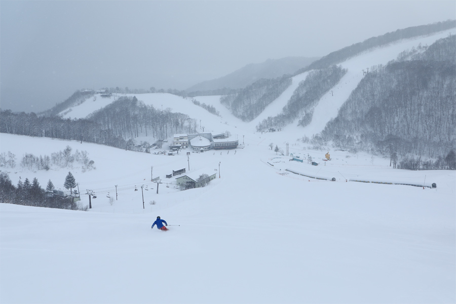8時半に第2ペアに乗れば黒沢ゲレンデ(写真)か一本ブナダウンヒルにファーストトラックを刻め、その後9時開始の第1クワッドに乗れば、コース1-Aか1-B・Cに一番乗りできます。黒沢は適度に締まった滑りやすい粉雪コンディション。1月の平日とあって来場者の出足はゆっくりで、ピステン跡が長らく保たれていました。