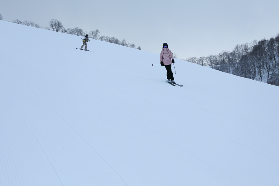 時々吹く弱い北風に乗って乾いた雪が降っていました。昨晩の新雪は1cm程度でしたが強い冷え込みは続いており、カメラを構える指先がジンジンとしびれました。コース1-Aは序盤~中盤が適度に柔らかな粉雪の圧雪、終盤の急斜面(写真)が適度に締まった粉雪の圧雪でした。