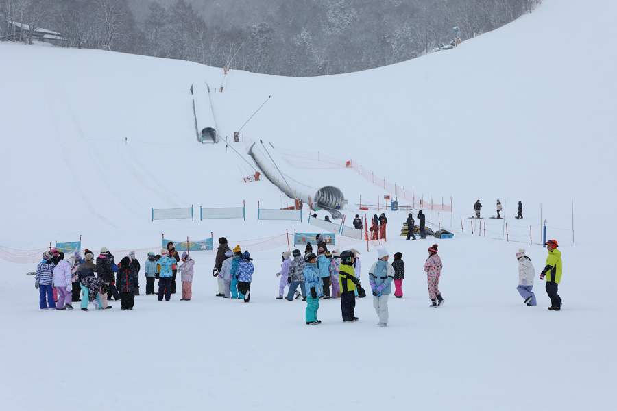 圧雪の丸山ゲレンデとコース5-Aも適度に締まった粉雪の圧雪で(人によっては硬め?)、コース5-B・Cの全面に張り付いた中~大サイズのコブも適度に締まった粉雪でした。ポケモンスノーアドベンチャー(写真)では10時頃から安曇野市の小学校の課外授業が始まりました。