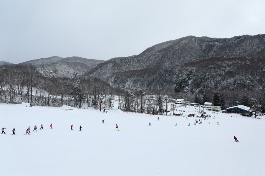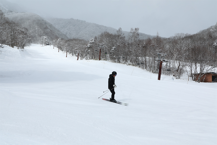 では果てしなく子供向けのゲレンデかと言えばそうでもなくて、上部の中急斜面で上級者も満足できるのが 爺ガ岳スキー場 の良いところ。最も急な雷鳥コース(写真、最大28度、平均27度、700m)を始め、ラビットコース、カモシカコースの各圧雪バーンでは、空いていたこともあって気持ち良くスピードに乗れました。