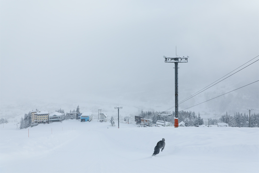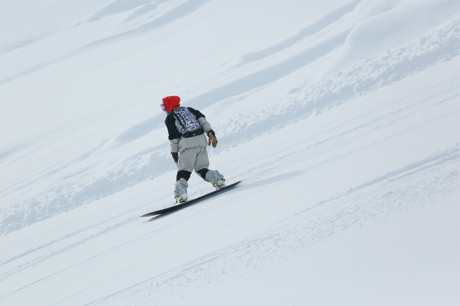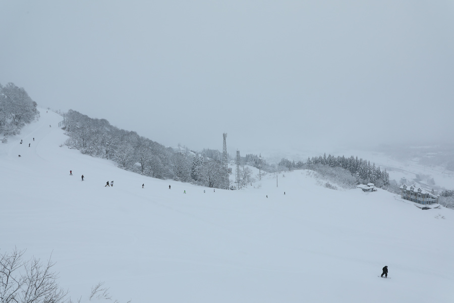 ジャイアントコース(写真)はコースの半分を占める圧雪バーンが適度に締まった粉雪。もう半分の非圧雪バーンは、柔らかな起伏と昨晩からのフカフカの新雪15~20cmがグッドバランスなコンディションでした。朝から強弱をつけながら降っていた雪は10時半頃に止み、青空が広がって行きました。