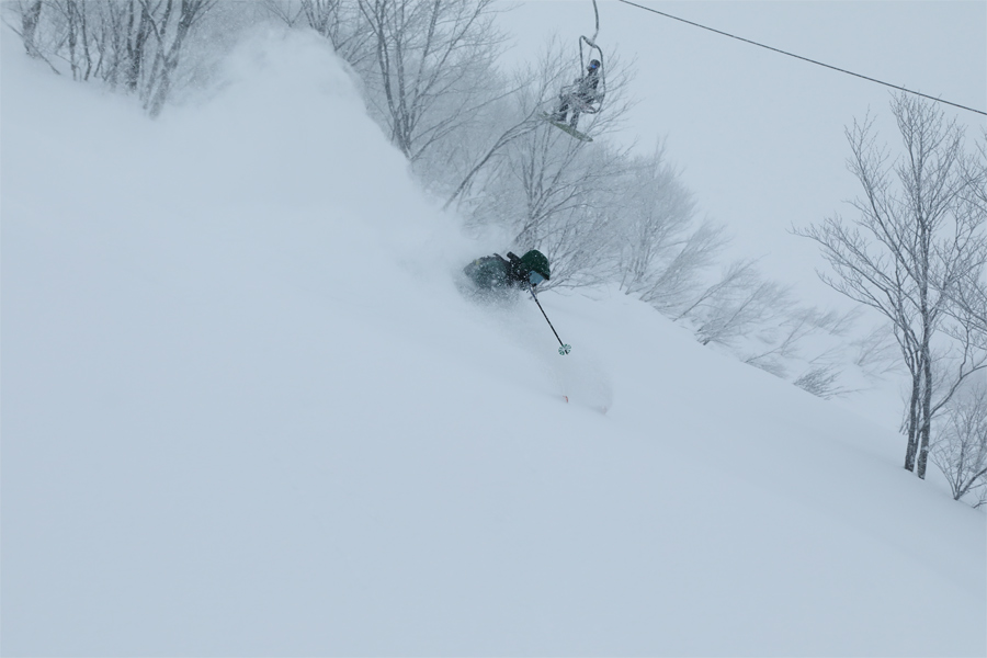 良く締まった粉雪の圧雪に軽い新雪が約15cm乗った兎平の南側ルートから非圧雪のアルペンクワッド沿い(写真)にドロップすると、40~45cmもの軽い新雪が迎えてくれました!良く締まったコブに若干底付きしたものの”ふかふわな”パウダーがたっぷり!ファーストトラック(写真)が刻まれたあと続々と歓声が上がりました。