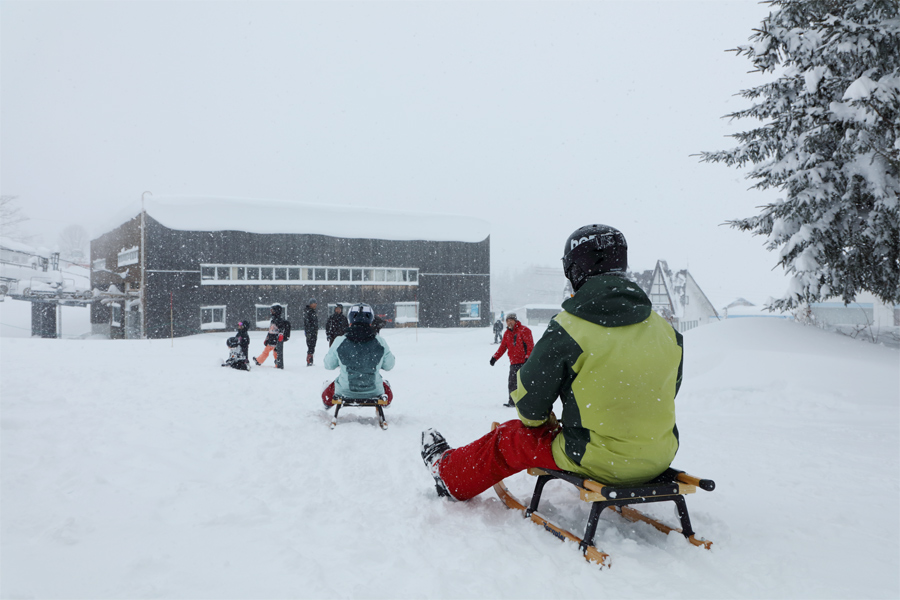 そりの先端についたロープを手で軽く引き上げつつ体重を移動すると曲がります。最初は感覚を掴めませんでしたが、数本滑るうちに曲がれるようになりました。「今日は雪が柔らかったですね。もう少し硬いほうが滑りやすいです。」とは参加された静岡県からのご夫婦(写真)。同イベントは2/15(日)にも行われます。