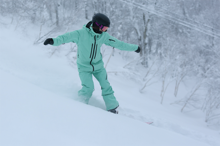 やまびこBの昨日からの新雪約20cmが軽くて、かつ1/24(土)~1/25(日)に積もった80cmもの乾いた雪が下地になっていたため抜群の浮遊感!「いつも見てます!」とのお声掛けと共に滑り込んでくださったスノーボーダーさん(写真)のノーズもふわっと浮いていました。
