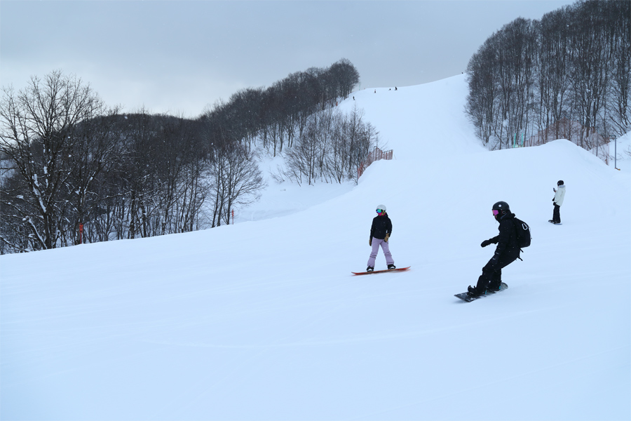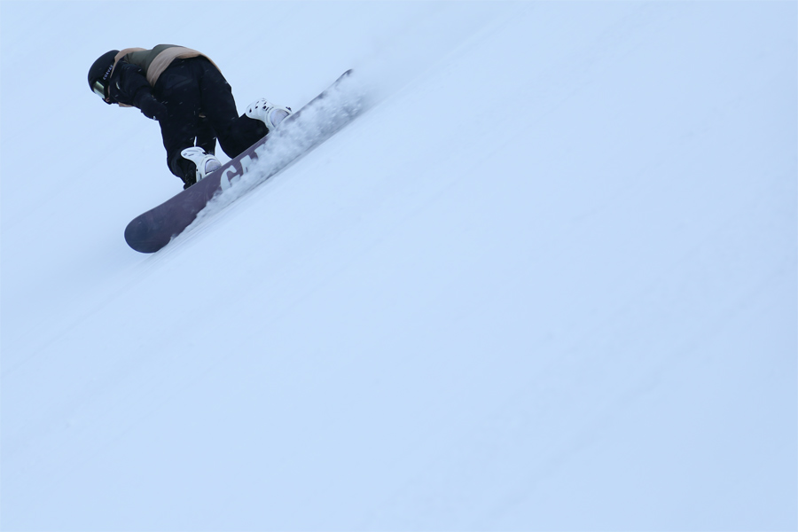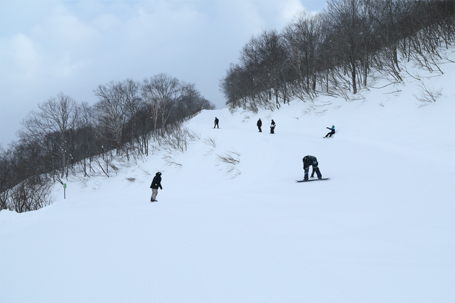 良く締まった粉雪の圧雪のルート1上部(写真)ではエッジを効かせて思い通りのターンを繰り返せました。圧雪のルート1下部は人工降雪機周辺が硬めでしたが、全体としては滑りやすい粉雪コンディション。スキー場中~上部では乾いた雪が弱く降っていました。