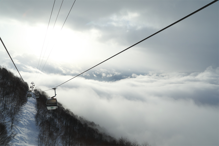 山のスケール、つがいけのスケールが感じられる、ちょっと不思議な朝。7時半頃の中央駐車場では乾いた雪が弱く降っていました。定刻の8時に動き出したゴンドラに乗り、低い標高に漂っていた雲を抜けると雪がピタリと止んで、東の空に荒々しくも美しい雲海が広がりました(写真、尚、ゴンドラ線下に付いているのはDBDのシュプール)。