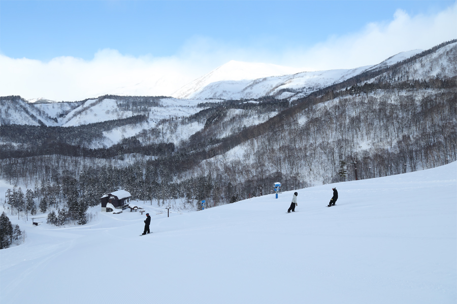 良く締まった粉雪の圧雪の栂の森ゲレンデ(写真)と御殿場コースは、自分が思っている以上に素晴らしいターンを切れる”超勘違いバーン”でした。軽い新雪が1~2cm乗った、適度に締まった非圧雪部分も滑りやすかったです。この夢から覚めないように、つが第2ペアで時間が許す限り回したくなりました。