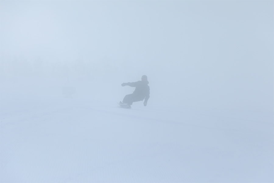 しかし、30分と経たないうちに上昇して来た雲が日光を遮り(写真)、やがて視界が真っ白になりました。良く締まった粉雪の圧雪のハンの木ゲレンデは、終盤の人工降雪機周辺にのみ硬い箇所がありましたが、概して滑りやすい粉雪コンディション!滑り降りて行くとハンの木終盤で雲下に抜けました。