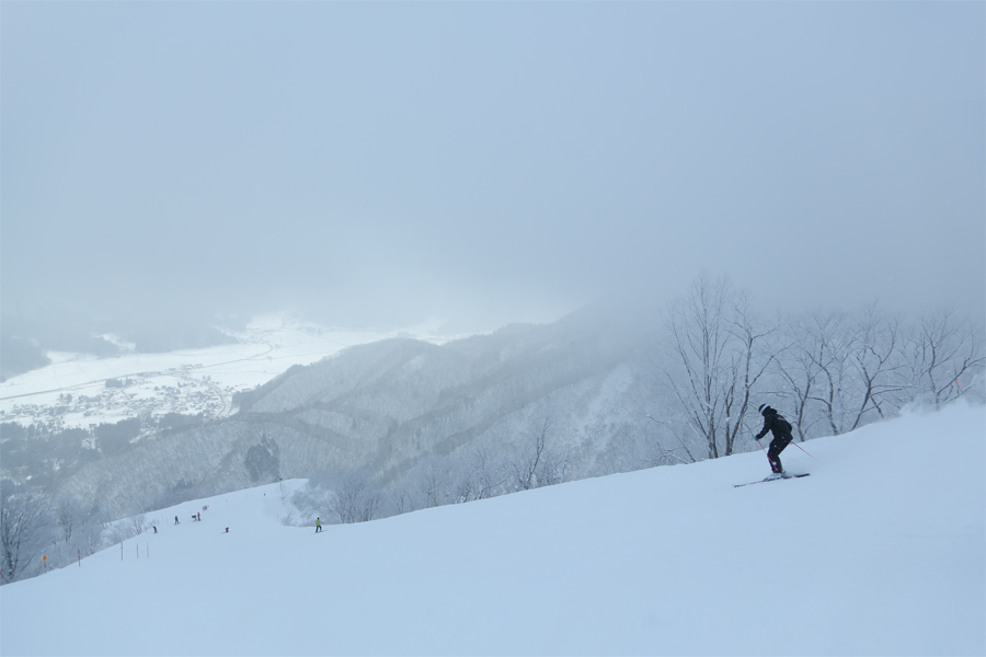 適度に締まった粉雪の圧雪のパノラマコースには軽い新雪が3~4cm、グランプリコースには7~8cm。滑りやすいバーンでしたが、視界が真っ白だったため目印をつけないと、自分がどこをどう滑っているのか分からなくなりました。良く締まった粉雪の圧雪に新雪が7~8cm乗ったダイナミックコースで雲下に抜けました(写真)。