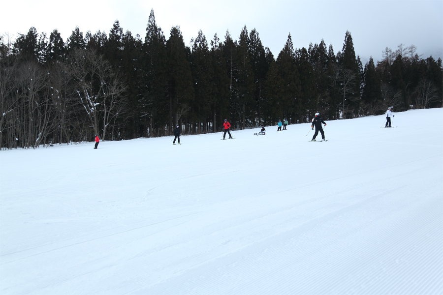 適度に締まった粉雪の圧雪に軽い新雪が1~2cm乗ったウッディコース、とおみゲレンデ、パウダースノーコースも滑りやすかったです。外国人のレッスンを中心に賑わっていたメリーランドコース(写真)とソフトクリームコースも適度に締まった粉雪の圧雪。初心者や初級者のレベルアップに最適だと思いました。