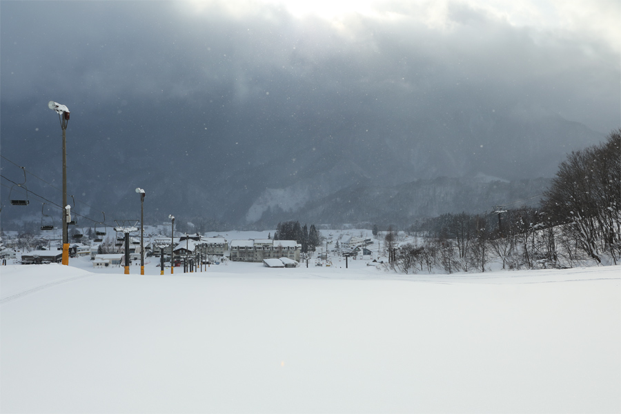 「全コース滑れる」「雪質が良い」「空いている」と三拍子揃った1月の平日のハクノリに絶対来るべき!薄日差す中、昨晩からの雪が静かに降る朝でした。適度に柔らかな粉雪の圧雪の若栗中央ゲレンデ(写真)、若栗林間コース、カモシカコースには軽い新雪が約5cmトッピングされていました。