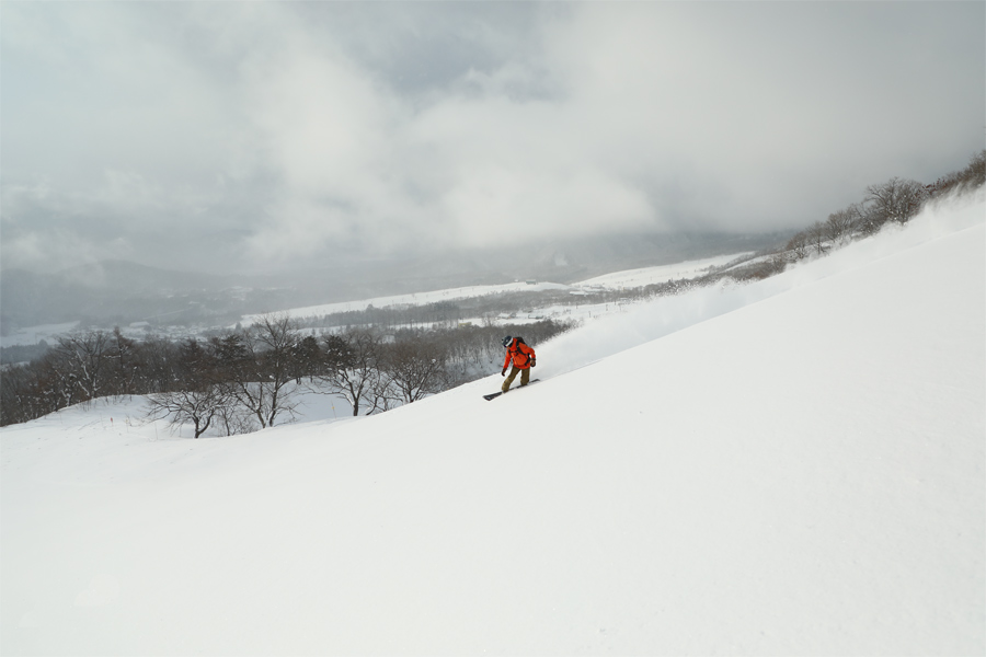 軽い新雪15~20cmが積もったハイウェイ後半の非圧雪部分(写真)も、下地の柔らかな起伏と相まって気持ち良く滑れました。適度に締まった粉雪の圧雪の里見中央ゲレンデと里見尾根コースには軽い新雪が5~10cm積もっていました。
