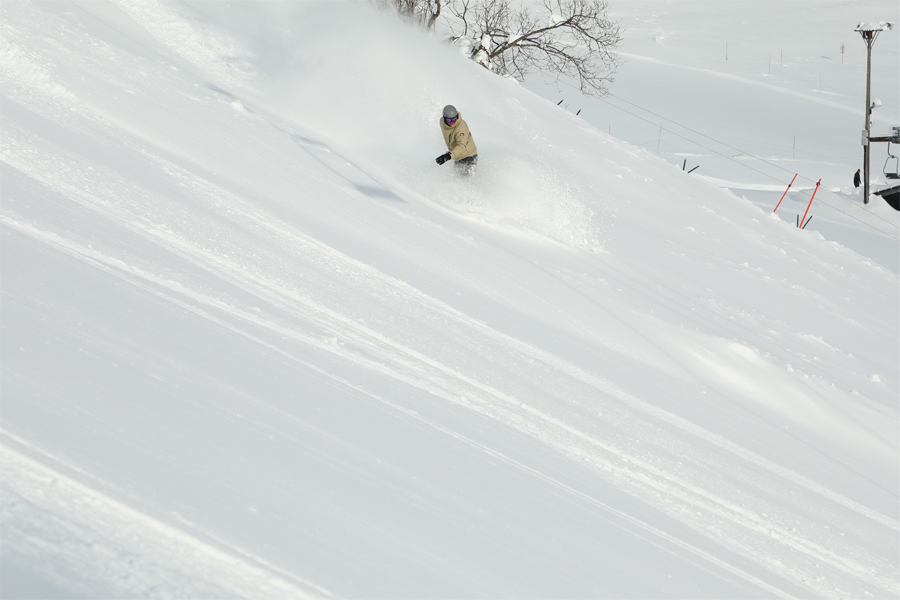 朝一はやはり8時開始の第3高速ペア(1,050m)で回したいところです。圧雪のハイウェイ、カモシカ、ハイウェイ前半→林道→若栗中央の3コースと、非圧雪のエキスパート、スネーク、自己責任エリアの計6通りがこのリフト1本で滑走可能。軽い新雪5~10cmが乗ったハイウェイ(写真)ではスプレーを上げて気持ち良くスピードに乗れました。