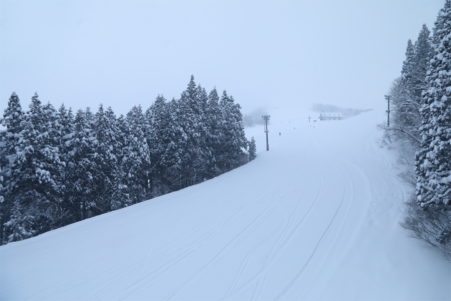 昨夕に麓で勢いよく降っていた雪は湿っていましたが、翌朝に積もっていた新雪約30cmはフワフワでした。ならばとAリフトに一番乗りしたレポーターは、乾いた雪降る中、前回取材時にオイシイ思いをしたヘラクレス(写真中央の急斜面)に向かいました。