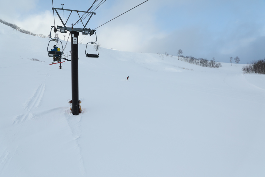 昨晩からの雪が弱い北西風に乗って今朝も降り続いていましたが、雲が切れて青空が覗いたり、薄日が差す場面もありました。わらび平ゲレンデの適度に柔らかな粉雪の圧雪部分には軽い新雪が約5cm、非圧雪部分には約10cm。第6ペア線下に続く跡(写真左下)は何だろうと興味をそそられながらスキー場トップを目指しました。